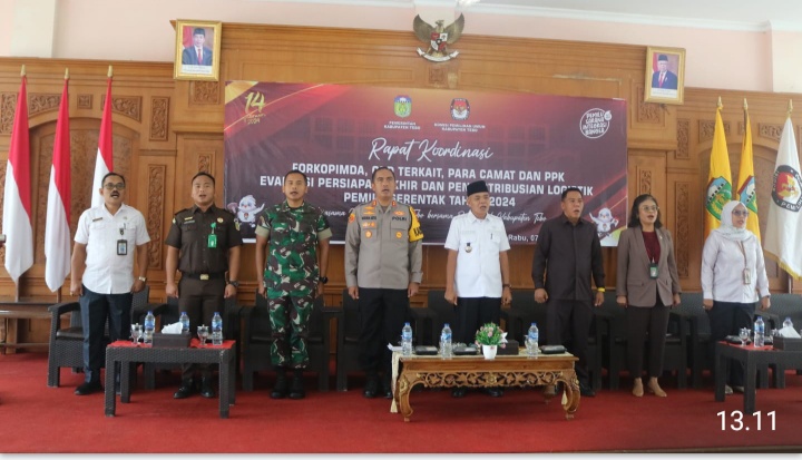 Dandim 0416/Bute Letkol Inf Arief Widyanto, SE., M.Han Melaksanakan Rapat Koordinasi Evaluasi persiapan akhir dan pendistribusian logistik pemilu serentak Tahun 2024 bertempat di aula pendopo rumah dinas Bupati Tebo Jalan lintas Tebo-Bungo Kelurahan tebing tinggi Kecamatan Tebo tengah Kabupaten Tebo, Rabu (07/02/2024).