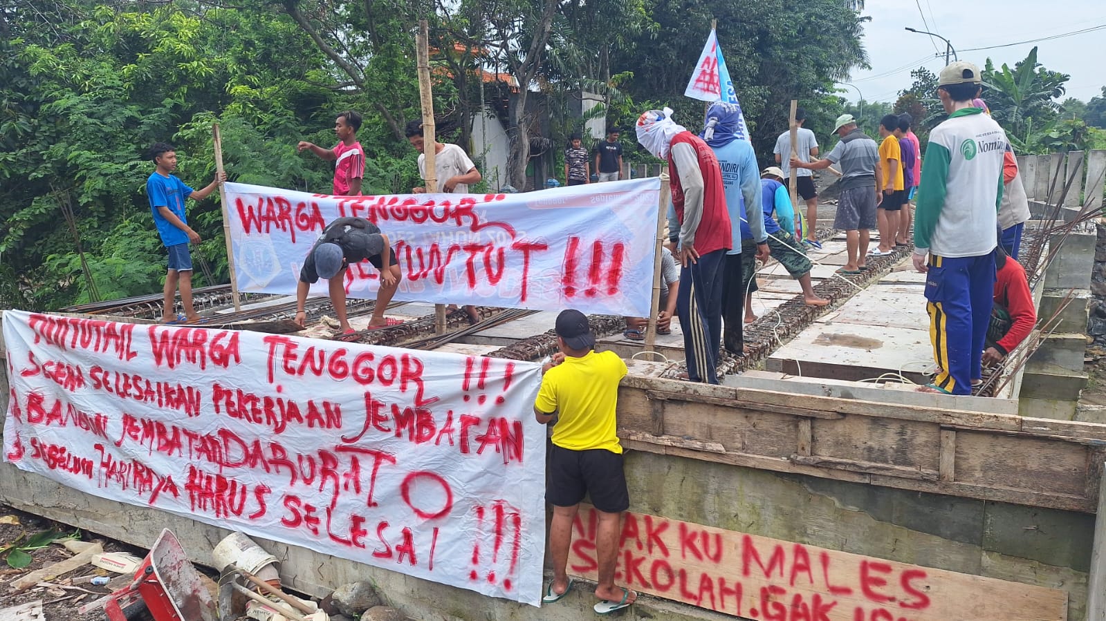 Karena pembangunan jembatan penghubung dua desa tersebut tak kunjung selesai dan mengakibatkan aktifitas masyarakat sekitar terganggu. Selain itu jalan alternatif yang dilalui juga cukup berbahaya bagi kendaraan roda dua karena bila musim hujan jalan alternatif licin dan berlumpur.