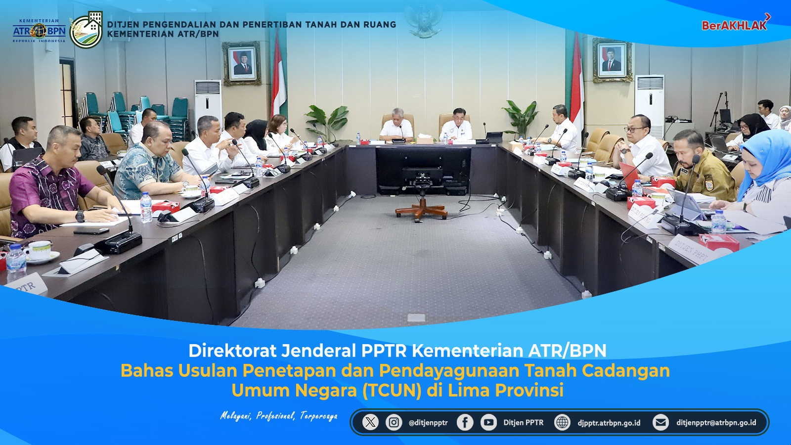 Jakarta – Kementerian Agraria dan Tata Ruang/Badan Pertanahan Nasional (ATR/BPN) melalui Direktorat Jenderal Pengendalian dan Penertiban Tanah dan Ruang (PPTR) menggelar rapat pembahasan usulan penetapan dan pendayagunaan Tanah Cadangan Umum Negara (TCUN) dari hasil penetapan tanah terlantar di lima provinsi pada hari ini, Rabu, (6/8/2025) di Ruang Rapat Prambanan Gedung Kementerian ATR/BPN.