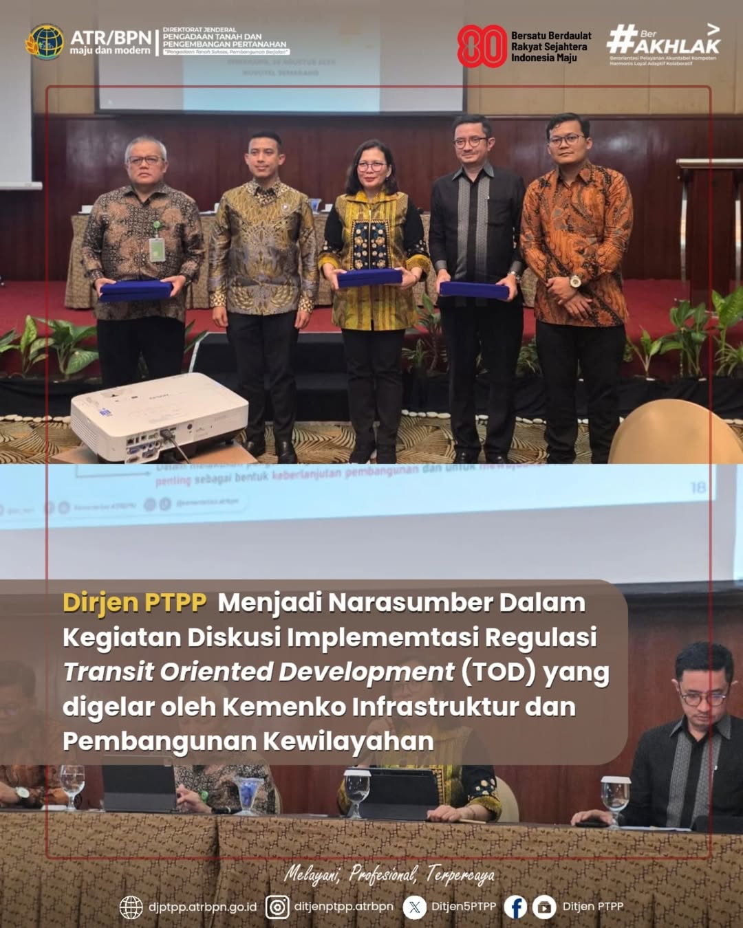 Semarang, 19 Agustus 2025 – Direktur Jenderal Pengadaan Tanah dan Pengembangan Pertanahan (Dirjen PTPP), Embun Sari menjadi narasumber pada Diskusi Panel Regulasi dan Tantangan Implementasi Transit Oriented Development (TOD) yang digelar oleh Kementerian Koordinator Bidang Infrastruktur dan Pembangunan Kewilayahan di Hotel Novotel Semarang, Selasa (19/8).