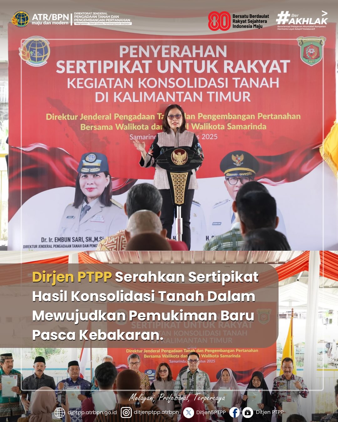 Samarinda, 14 Agustus 2025 – Direktur Jenderal Pengadaan Tanah dan Pengembangan Pertanahan (Dirjen PTPP) Embun Sari, didampingi Sekretaris Ditjen PTPP Tensa Nurdiyani, Direktur Konsolidasi Tanah Trias, serta Walikota Samarinda Andi Harun, secara simbolis menyerahkan 47 sertipikat hasil Konsolidasi Tanah kepada masyarakat, Kamis (14/8).