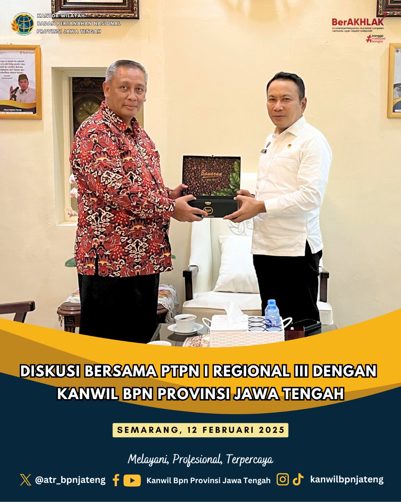 Didampingi oleh Kabid Penetapan Hak dan Pendaftaran, Wahyu Setyoko, Kakanwil BPN Prov. Jateng Lampri melakukan diskusi bersama Region Head PTPN I Regional 3, Tri Septiono dan jajarannya. Dalam pertemuan yang berlangsung di Kanwil BPN Prov.Jateng, kedua belah pihak membahas sejumlah langkah teknis terkait proses pelayanan pertanahan atas sejumlah lahan milik PTPN. Proses ini sangat penting untuk memastikan status hukum lahan yang digunakan oleh perusahaan perkebunan negara tersebut tetap sah dan dapat digunakan untuk berbagai keperluan, termasuk pengembangan usaha.