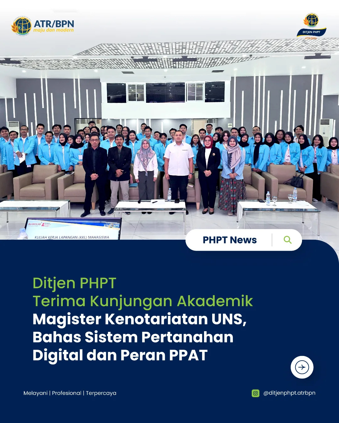 Direktorat Jenderal Penetapan Hak dan Pendaftaran Tanah (Ditjen PHPT) menerima kunjungan akademik dari Program Studi Magister Kenotariatan, Fakultas Hukum, Universitas Sebelas Maret (UNS) di Aula Prona, Kementerian ATR/BPN, pada Selasa (15/07/2025). Kegiatan ini merupakan bagian dari komitmen Ditjen PHPT dalam mendukung peningkatan pemahaman generasi muda terhadap sistem pertanahan nasional.