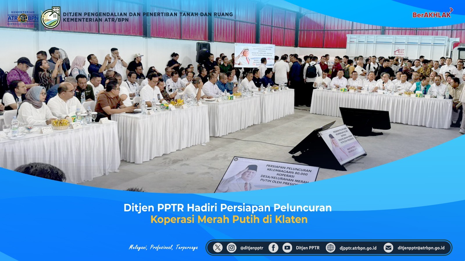 Klaten – Direktur Jenderal Pengendalian dan Penertiban Tanah dan Ruang (Dirjen PPTR) Kementerian ATR/BPN, Jonahar, menghadiri rapat persiapan peluncuran Koperasi Desa/Kelurahan Merah Putih yang dipusatkan di Desa Bentangan, Kecamatan Wonosari, Kabupaten Klaten, Jawa Tengah pada Minggu, (13/7/2025). Kehadiran Dirjen PPTR dalam kegiatan ini mewakili Menteri ATR/Kepala BPN sebagai bentuk dukungan terhadap penguatan kelembagaan ekonomi kerakyatan melalui koperasi desa dan kelurahan.