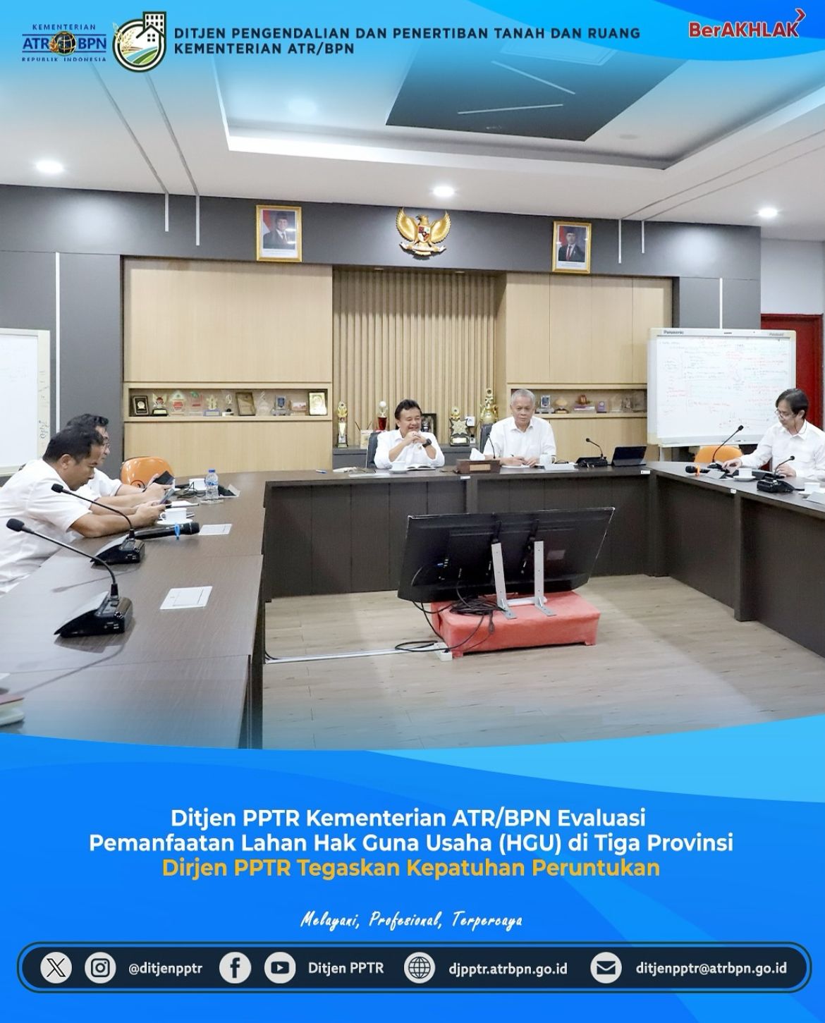 Jakarta – Direktorat Jenderal Pengendalian dan Penertiban Tanah dan Ruang (PPTR) Kementerian Agraria dan Tata Ruang/Badan Pertanahan Nasional (ATR/BPN) menggelar menggelar rapat evaluasi pengendalian tanah terindikasi telantar bersama Kantor Wilayah BPN dari tiga provinsi yaitu Nusa Tenggara Timur, Riau, dan Bengkulu. Rapat dipimpin oleh Direktur Jenderal PPTR, Jonahar, dan dihadiri oleh seluruh pejabat eselon II, yakni Sekretaris Ditjen PPTR, Ariodilah Virgantara; Direktur Penertiban Penguasaan, Pemilikan dan Penggunaan Tanah, Sepyo Achanto; Direktur Pengendalian Pemanfaatan Ruang, Aria Indra Purnama; Direktur Penertiban Pemanfaatan Ruang, Agus Sutanto serta Tenaga Ahli, Adi Darmawan.