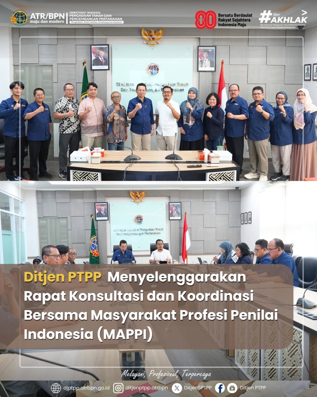 Rapat ini menjadi momentum untuk menyusun langkah strategis ke depan demi menciptakan ekosistem penilaian yang profesional, adaptif, dan berdaya saing tinggi. Kerja sama Ditjen PTPP dan MAPPI bukan sekadar kemitraan teknis, tetapi komitmen bersama untuk mendorong transformasi dan peningkatan kualitas layanan penilaian tanah dan properti di Indonesia.