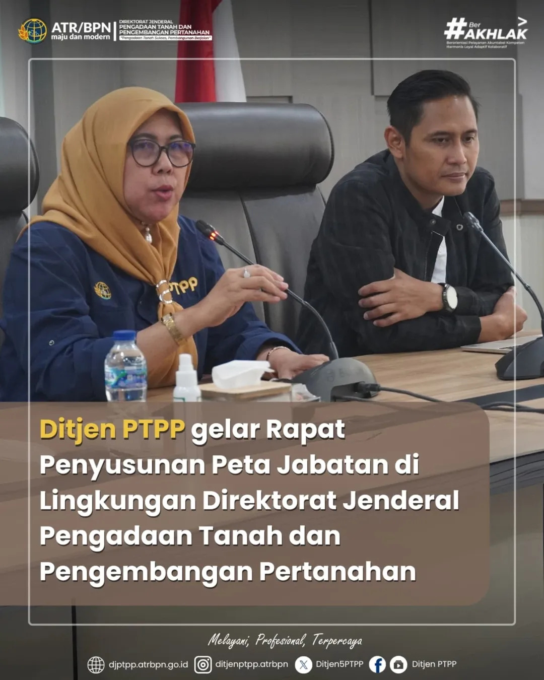 Jakarta, 24 Juli 2025 – Direktorat Jenderal Pengadaan Tanah dan Pengembangan Pertanahan (Ditjen PTPP), Kementerian ATR/BPN, menyelenggarakan Rapat Penyusunan Peta Jabatan sebagai langkah strategis dalam membangun tata kelola organisasi yang lebih adaptif, akuntabel, dan berbasis kompetensi.