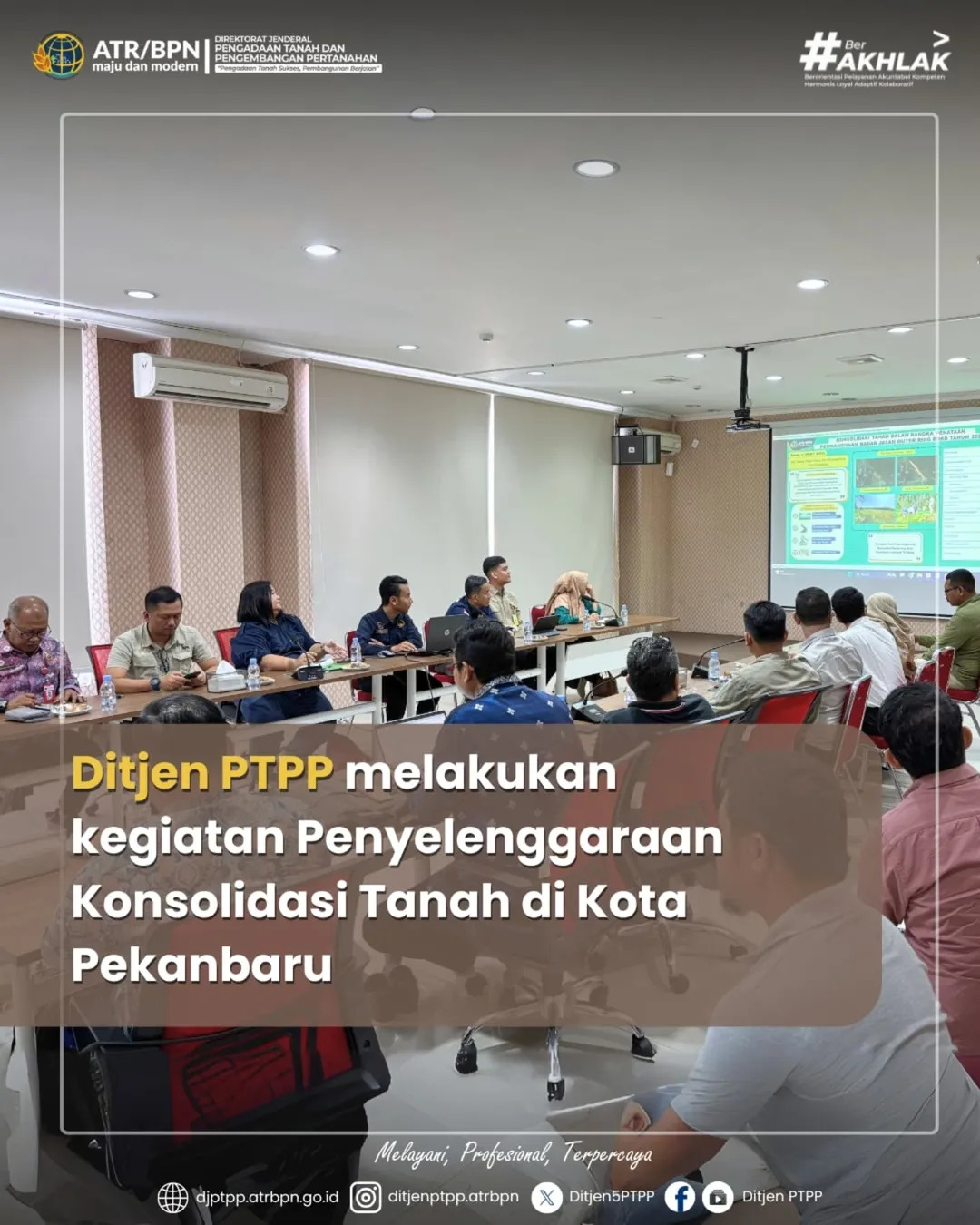 Pekanbaru, Riau, 24–25 Juli 2025 — Direktorat Jenderal Pengadaan Tanah dan Pengembangan Pertanahan (Ditjen PTPP), Kementerian Agraria dan Tata Ruang/Badan Pertanahan Nasional (ATR/BPN), melalui Subdirektorat Penyelenggaraan Konsolidasi Tanah Wilayah II, melaksanakan kegiatan Monitoring Penyelenggaraan Konsolidasi Tanah di Kota Pekanbaru, Provinsi Riau.