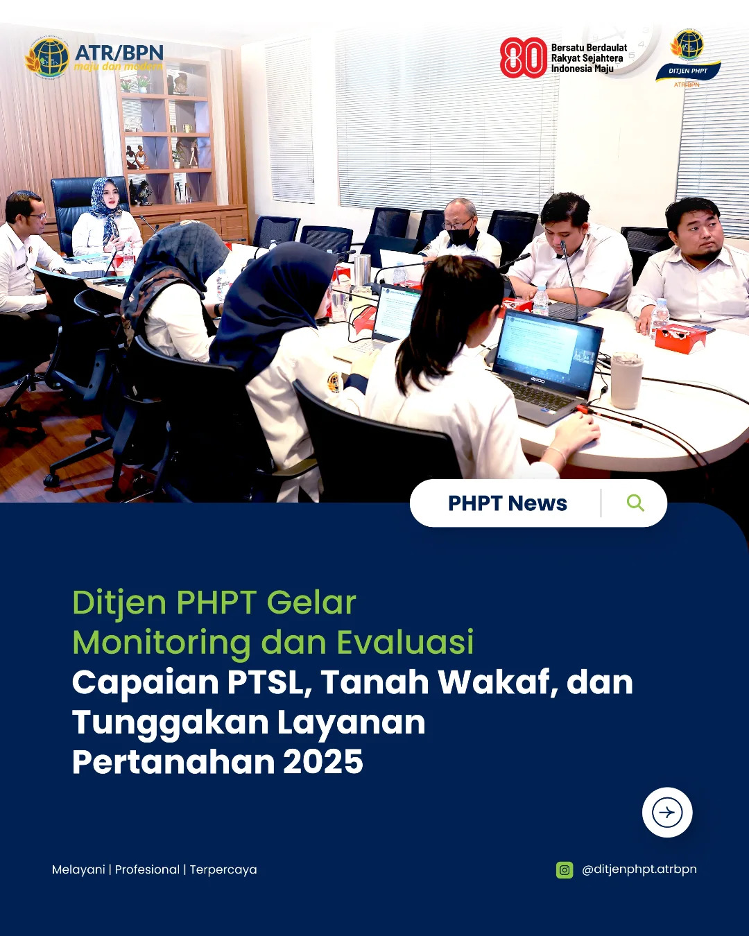 Sebagai upaya menjaga kualitas layanan pertanahan, Direktorat Jenderal Penetapan Hak dan Pendaftaran Tanah (Ditjen PHPT) menggelar kegiatan Monitoring dan Evaluasi Capaian Pendaftaran Tanah Sistematis Lengkap (PTSL), capaian pendaftaran tanah wakaf, serta tunggakan layanan pertanahan tahun 2025. Kegiatan ini dilaksanakan secara hybrid pada Kamis (07/08/2025) dan dipimpin langsung oleh Direktur Jenderal Penetapan Hak dan Pendaftaran Tanah, Asnaedi.