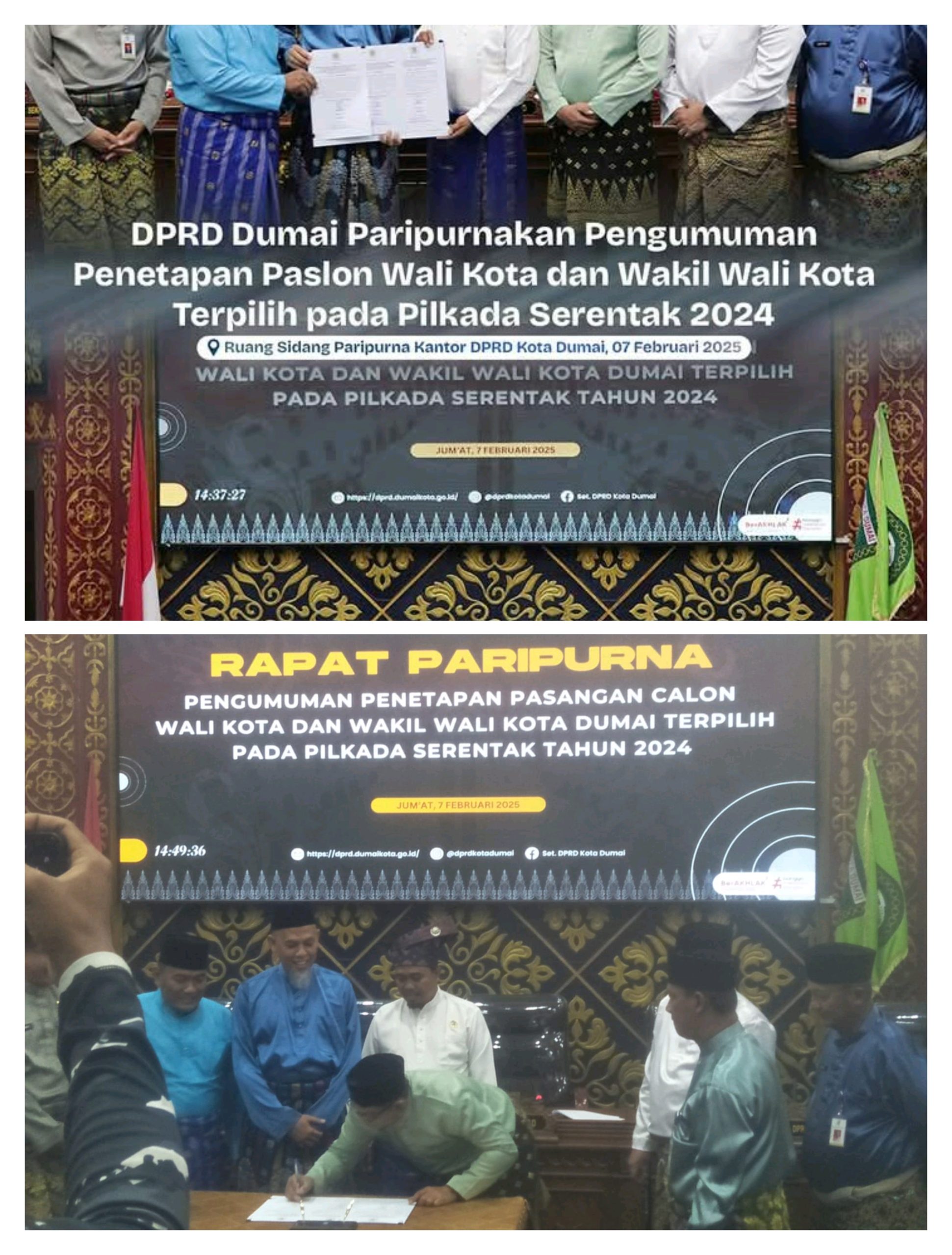 “Atas rahmat Allah SWT Tuhan YME, kita dapat menghadiri rapat Paripurna DPRD Kota Dumai dalam rangka Pengumuman Penetapan Pasangan Calon (Paslon) Wali Kota dan Wakil Wali Kota Dumai Terpilih Periode 2025-2030 pada Pilkada Serentak Tahun 2024,” ungkapnya.