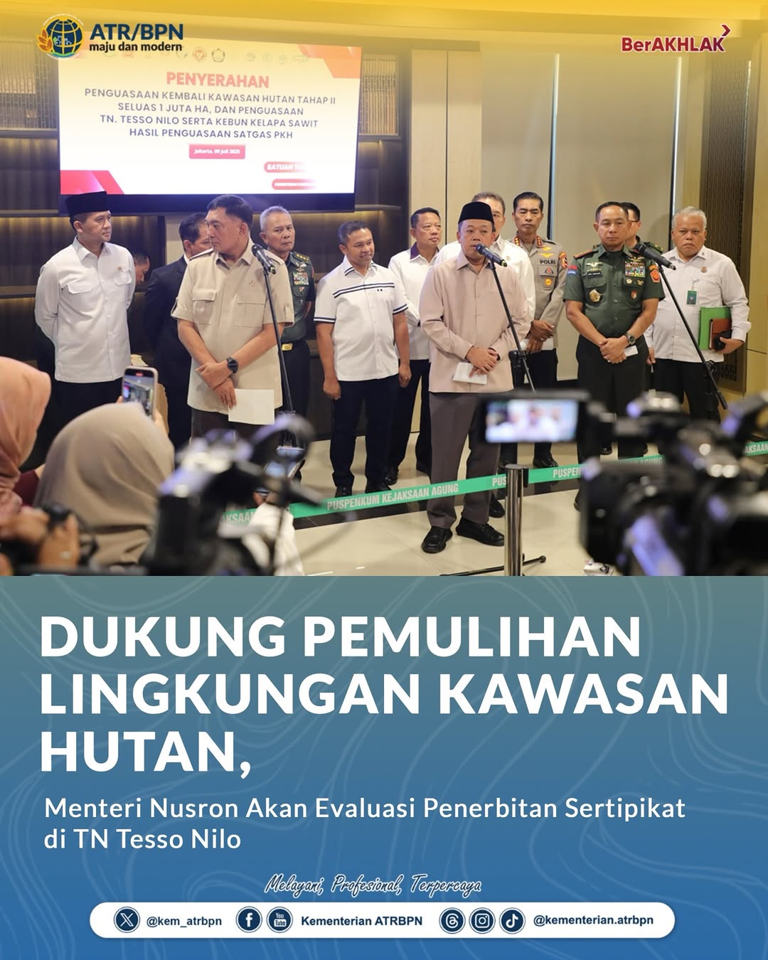 Jakarta – Satuan Tugas Penertiban Kawasan Hutan (Satgas PKH) tengah melakukan reforestasi atau pemulihan kembali kawasan hutan Taman Nasional (TN) Tesso Nilo di Riau, pasca mengalami penurunan fungsi akibat perambahan hutan secara ilegal. Dalam upaya pemulihan kembali, Kementerian Agraria dan Tata Ruang/Badan Pertanahan Nasional (ATR/BPN) akan mengevaluasi Sertipikat Hak Milik (SHM) yang terindikasi berada dalam kawasan taman nasional tersebut.