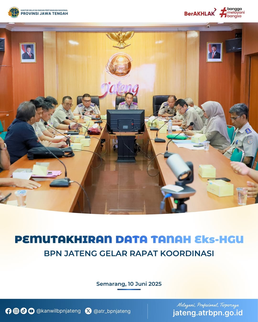 Semarang – Kompas86.com // Kepala Kantor Wilayah Badan Pertanahan Nasional (BPN) Provinsi Jawa Tengah, Lampri, memimpin rapat koordinasi terkait pemutakhiran data tanah terindikasi terlantar yang berasal dari tanah berstatus Hak Guna Usaha (HGU) yang telah berakhir, pada Selasa (10/06/2025).