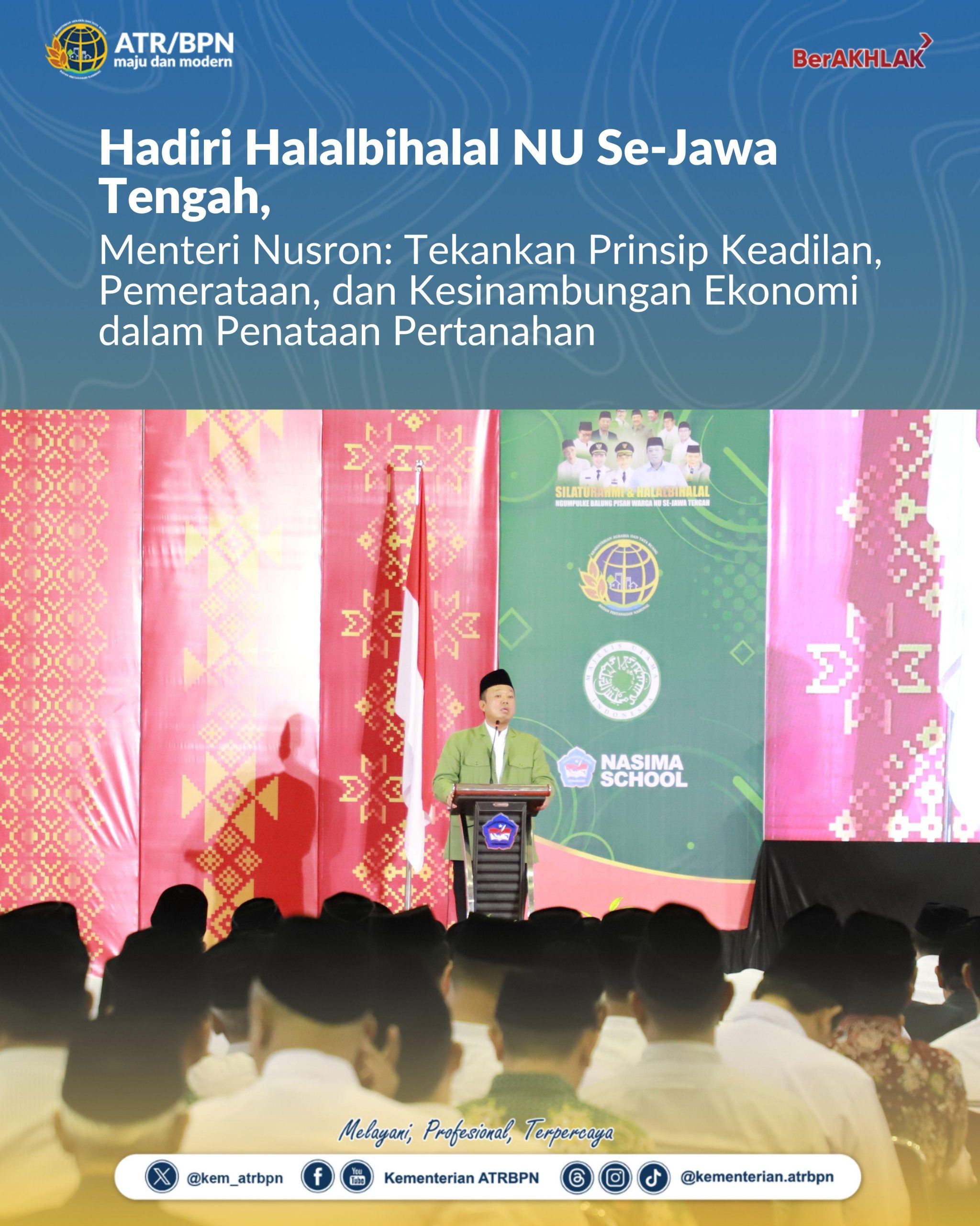 Hadiri Halalbihalal NU Se-Jawa Tengah, Menteri Nusron: Tekankan Prinsip Keadilan, Pemerataan, dan Kesinambungan Ekonomi dalam Penataan Pertanahan