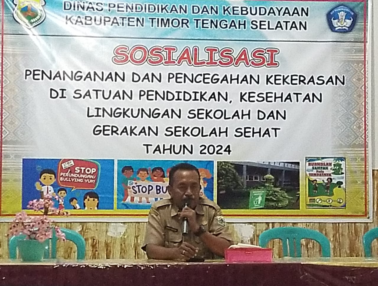 Kabid Pembinaan bidang SMP Kabupaten Timor Tengah Selatan, Provinsi Nusa Tenggara Timur, David Mbolik menutup Kegiatan Sosialisasi Penanganan Kekerasan di Satuan Pendidikan Kesehatan Lingkungan Sekolah dan Sekolah Sehat, Tahun 2024.