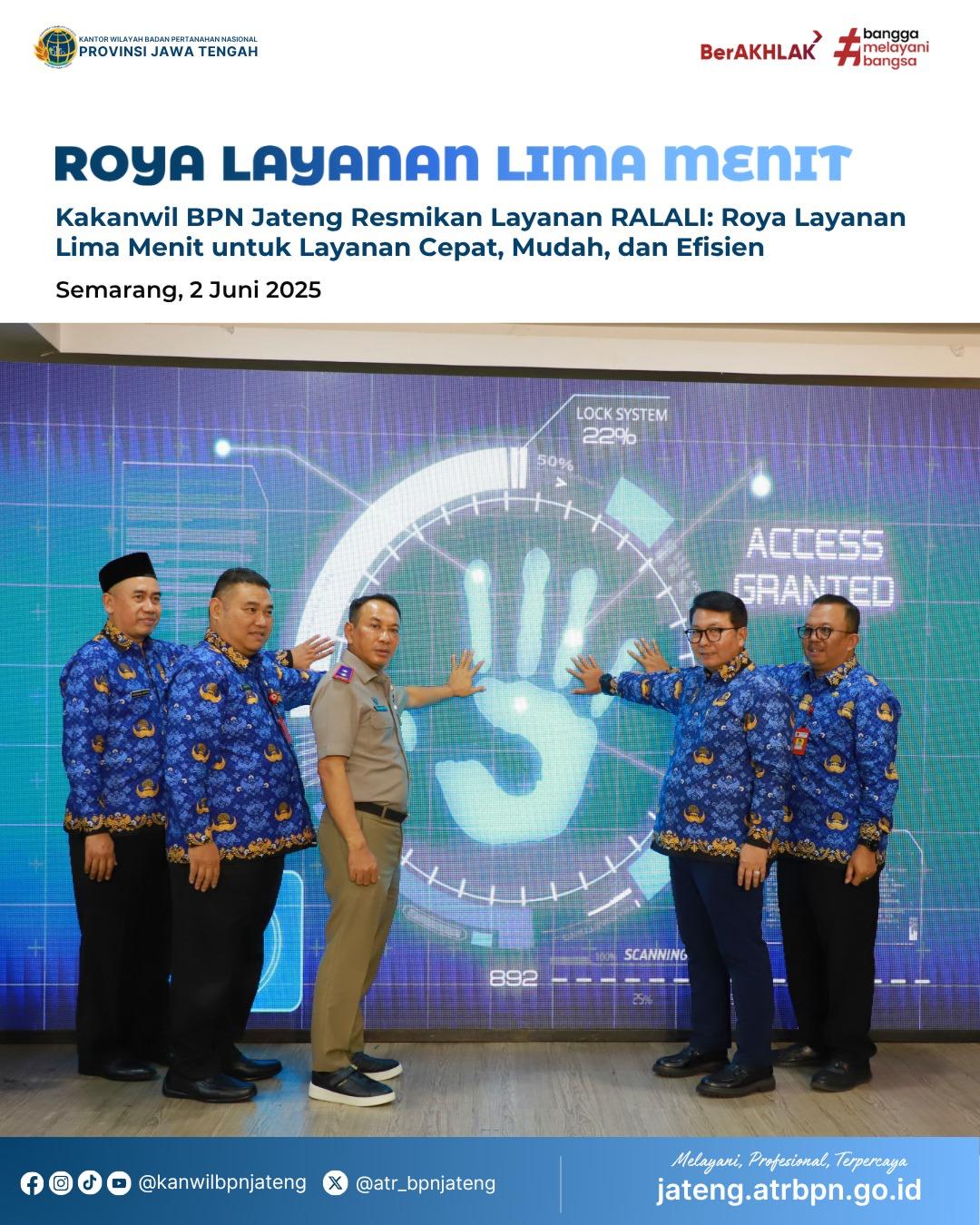 Semarang-Dalam upaya meningkatkan kualitas pelayanan publik di bidang pertanahan, Kepala Kantor Wilayah Badan Pertanahan Nasional (BPN) Provinsi Jawa Tengah, Lampri secara resmi meluncurkan layanan RALALI (Roya Layanan Lima Menit) pada Senin, 2 Juni 2025, bertempat di Kantor Pertanahan Kota Semarang. Peluncuran ini diikuti secara daring dan luring oleh jajaran Kanwil BPN Jateng serta seluruh Kantor Pertanahan Kabupaten/Kota se-Jawa Tengah.