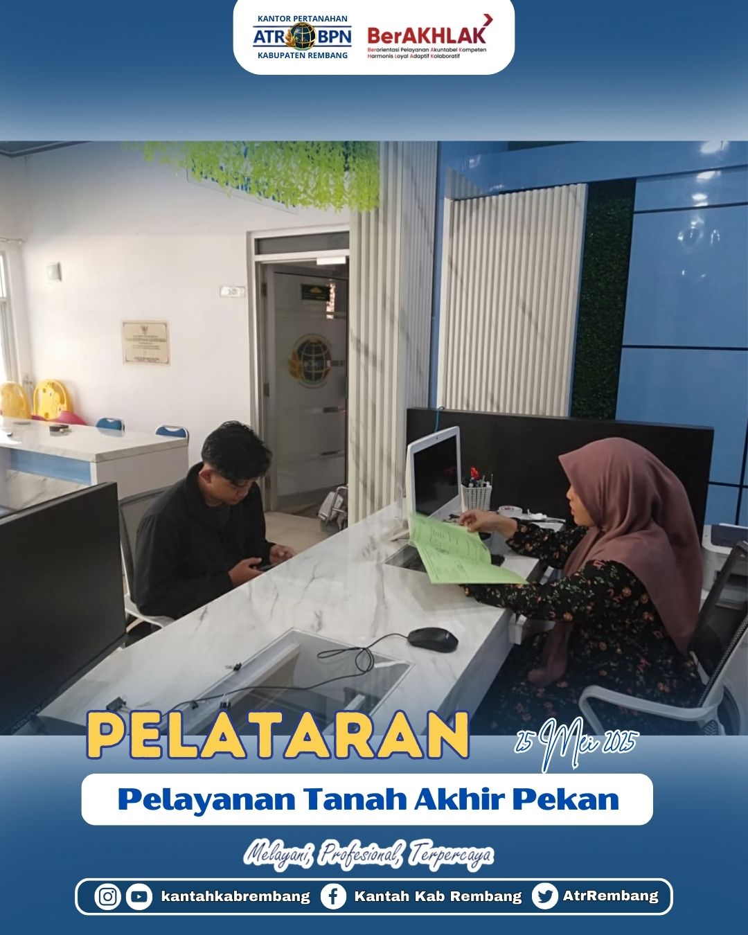 Pada hari Sabtu, layanan yang diberikan di Kantor Pertanahan Kabupaten Rembang mencakup berbagai keperluan, seperti pengajuan sertifikat tanah, balik nama, pengecekan berkas, hingga konsultasi teknis mengenai pendaftaran tanah. Masyarakat cukup datang langsung ke kantor dengan membawa dokumen yang diperlukan.