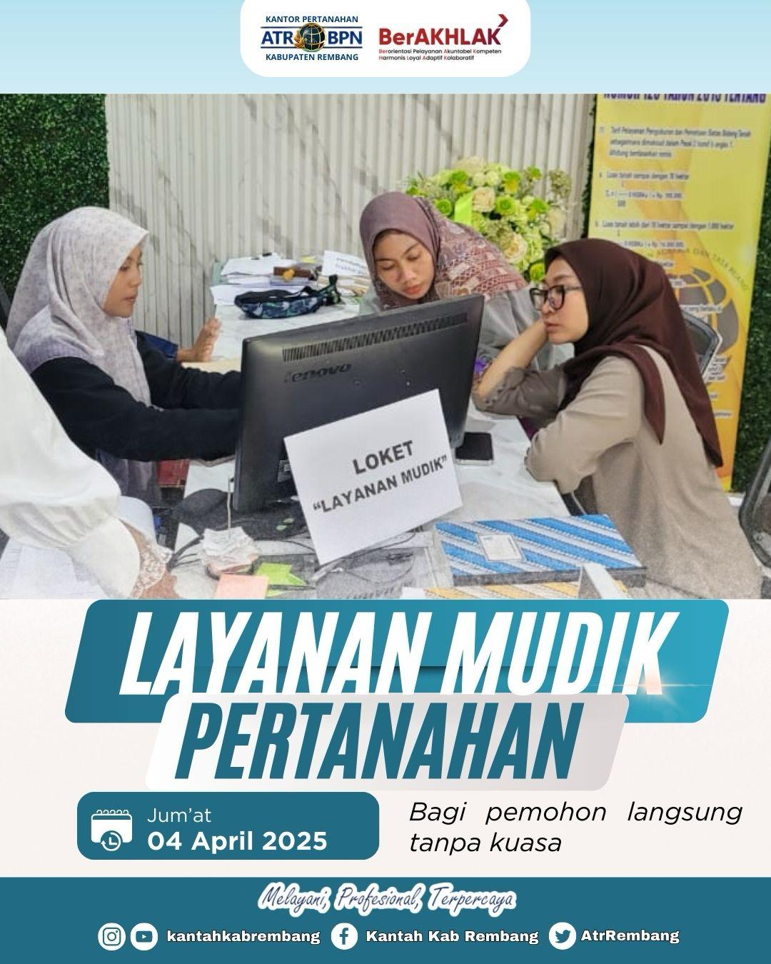 Rembang, Kompas86.com – Sehubungan dengan Pelayanan Pertanahan Terbatas, pada hari Jum’at (04/04/2025) Kantor Pertanahan Kabupaten Rembang membuka Loket Layanan Mudik Pertanahan. Terdapat pemohon yang berkonsultasi terkait sertipikat pengganti karena rusak.