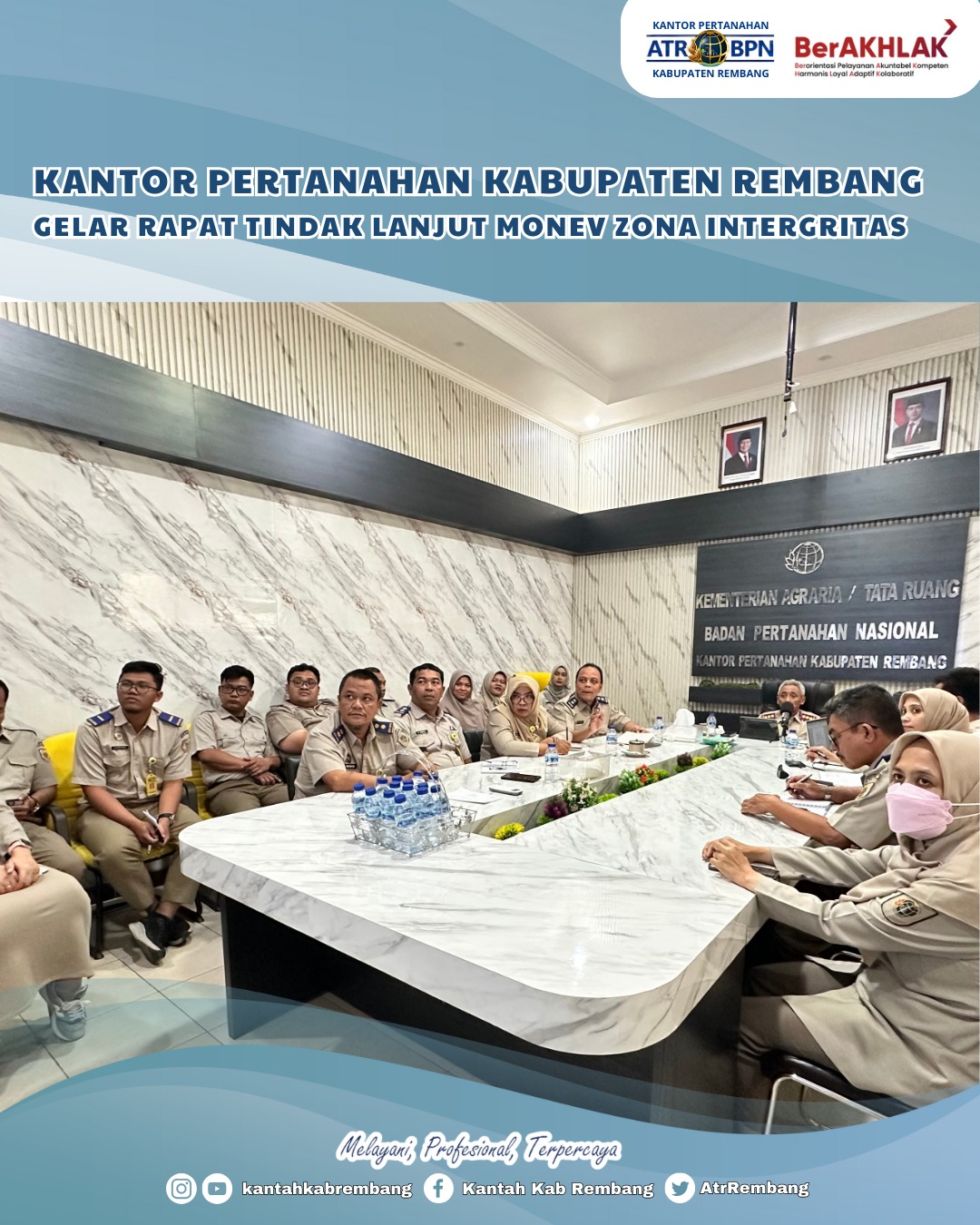 Rapat yang berlangsung di ruang rapat ini dipimpin langsung oleh Kepala Kantor Pertanahan Kabupaten Rembang dan dihadiri oleh seluruh pejabat pengawas serta anggota Tim ZI. Agenda utama rapat ini adalah menelaah hasil temuan dan rekomendasi dari tim monev Kanwil serta merumuskan langkah-langkah konkret untuk penyempurnaan implementasi ZI di lingkungan Kantor Pertanahan Kabupaten Rembang.