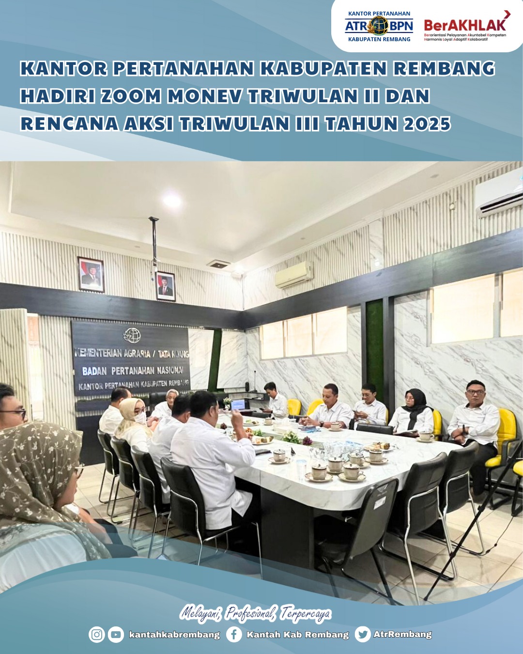 Rembang – Kantor Pertanahan Kabupaten Rembang mengikuti kegiatan Monitoring dan Evaluasi (Monev) Triwulan II serta penyusunan Rencana Aksi Triwulan III Tahun 2025 yang diselenggarakan secara daring oleh Kantor Wilayah Badan Pertanahan Nasional (BPN) Provinsi Jawa Tengah pada Rabu (16/07/2025).