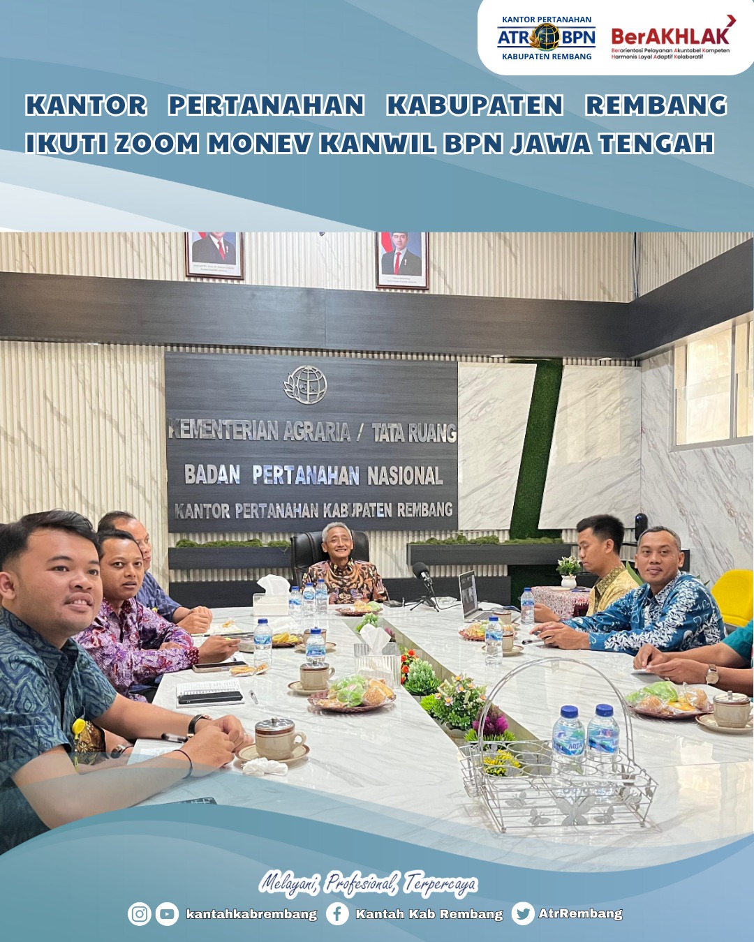 Rembang – Kepala Kantor Pertanahan Kabupaten Rembang bersama Pejabat Pengawas dan Kelompok Koordinator Substansi (KKS) dari masing-masing seksi mengikuti kegiatan monitoring dan evaluasi (monev) yang diselenggarakan oleh Kantor Wilayah Badan Pertanahan Nasional (BPN) Provinsi Jawa Tengah. Kegiatan ini dilaksanakan secara daring melalui aplikasi Zoom Meeting pada Kamis (07/08/2025) di ruang rapat Kantor Pertanahan Kabupaten Rembang.