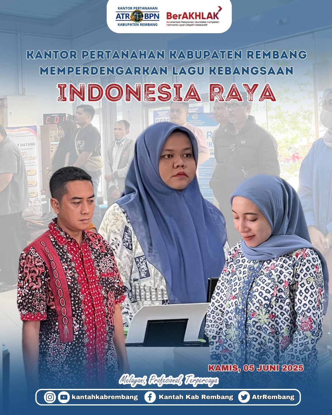 Rembang – Kompas86.com // Kantor Pertanahan Kabupaten Rembang memperdengarkan lagu kebangsaan Indonesia Raya pada hari Kamis, 05 Juni 2025 pada pukul 10.00 WIB.