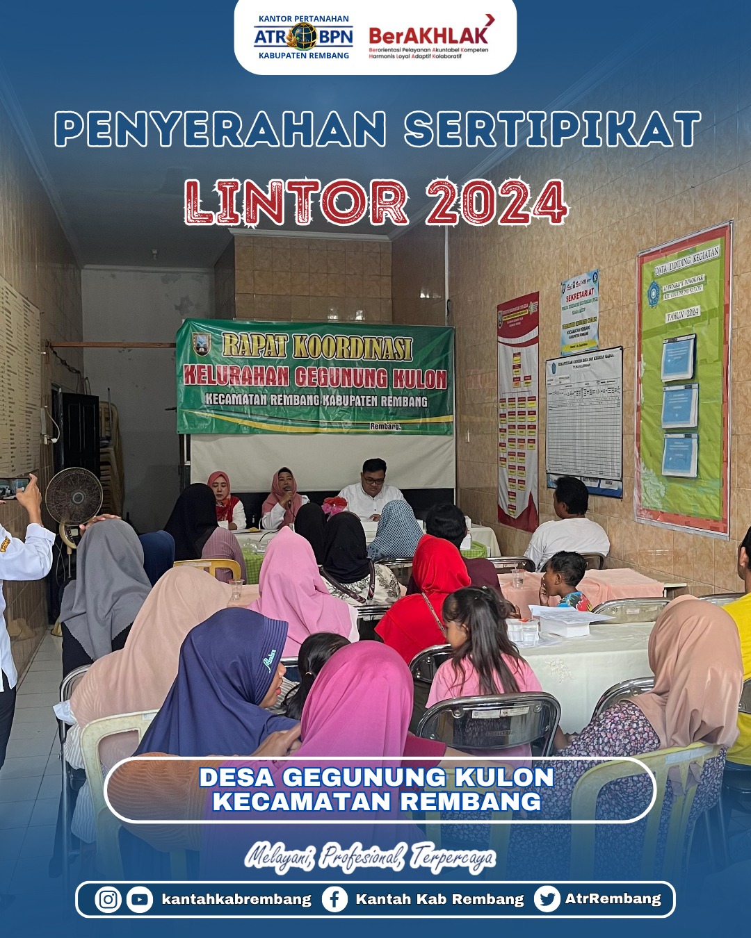 Rembang – Kantor Pertanahan Kabupaten Rembang kembali menunjukkan komitmennya dalam mempercepat penataan dan kepastian hukum atas tanah masyarakat dengan menyerahkan sertipikat tanah lintas sektor kepada warga Desa Gegunung Kulon, Kecamatan Rembang, pada Rabu (14/5).