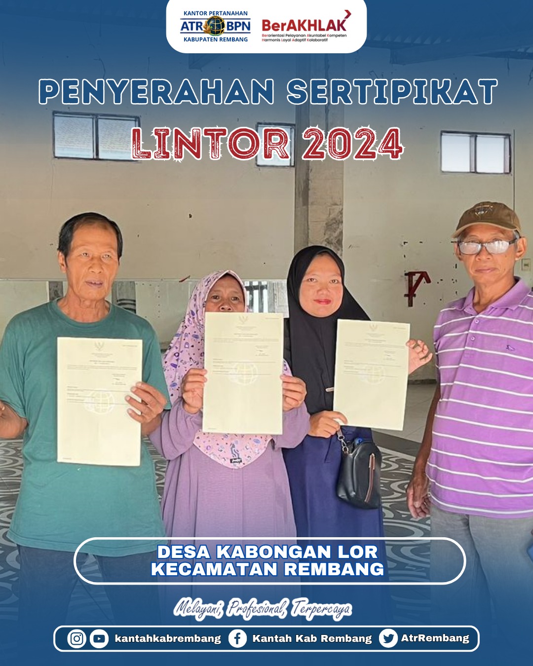 Rembang – Kantor Pertanahan Kabupaten Rembang kembali menunjukkan komitmennya dalam mempercepat penataan dan kepastian hukum atas tanah masyarakat dengan menyerahkan sertipikat tanah lintas sektor kepada warga Desa Kabongan Lor Kecamatan Rembang pada Kamis (15/5).