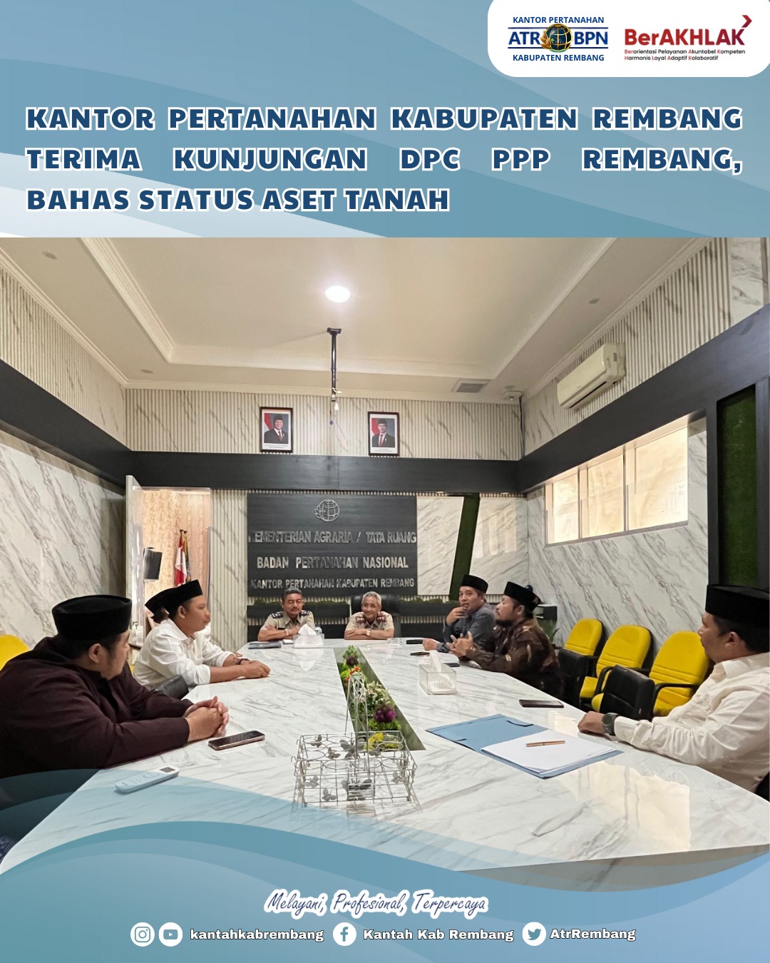 Rombongan DPC PPP diterima langsung oleh jajaran pejabat Kantor Pertanahan Kabupaten Rembang. Dalam pertemuan tersebut, pihak DPC PPP menyampaikan kebutuhan akan kejelasan status tanah yang mereka miliki agar dapat dikelola secara optimal dan sesuai dengan ketentuan hukum yang berlaku.