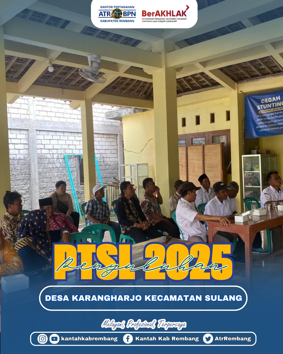 Bertempat di Balai Desa Karangharjo, kegiatan sosialisasi dihadiri oleh perwakilan Kantor Pertanahan, perangkat desa, serta ratusan warga setempat. Materi yang disampaikan mencakup alur pelaksanaan PTSL mulai dari pendataan, pengukuran bidang tanah, penyusunan berkas administrasi, hingga proses penerbitan sertifikat.