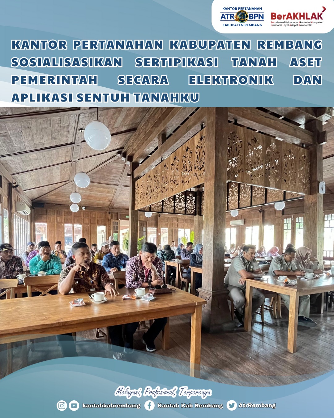 Rembang – Kantor Pertanahan Kabupaten Rembang menggelar Sosialisasi Sertipikasi Tanah Aset Instansi Pemerintah Secara Elektronik serta penggunaan aplikasi Sentuh Tanahku pada Selasa (12/08/2025) di Prau Kuno, Rembang. Kegiatan ini bertujuan untuk meningkatkan pemahaman instansi pemerintah dan pemerintah desa dalam mengamankan aset tanah melalui pendaftaran dan sertipikasi secara elektronik.