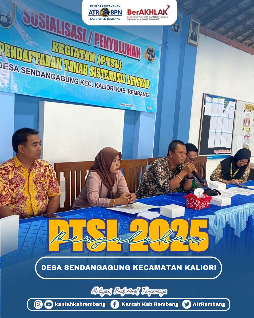 Rembang – Kantor Pertanahan Kabupaten Rembang menggelar kegiatan penyuluhan Pendaftaran Tanah Sistematis Lengkap (PTSL) di Desa Sendangagung, Kecamatan Kaliori. Kegiatan ini merupakan bagian dari program pemerintah untuk mempercepat legalisasi aset masyarakat melalui pendaftaran tanah secara menyeluruh.