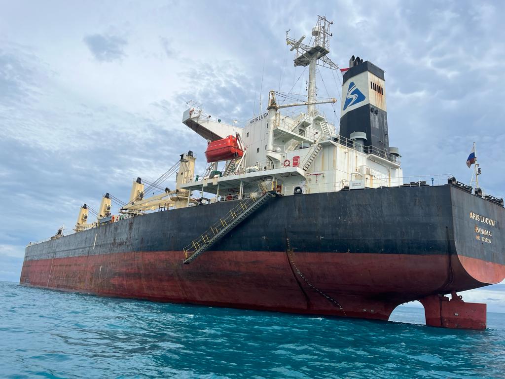 Kapal : ARIS LUCKYT PANAMA memiliki (empat) 4 tiang kren,terlihat jelas kapal yang kabarnya akan memabawa hasil tambang pasir silica dari Kabupaten Lingga. titik tambang berada di kecamatan Lingga Timur,