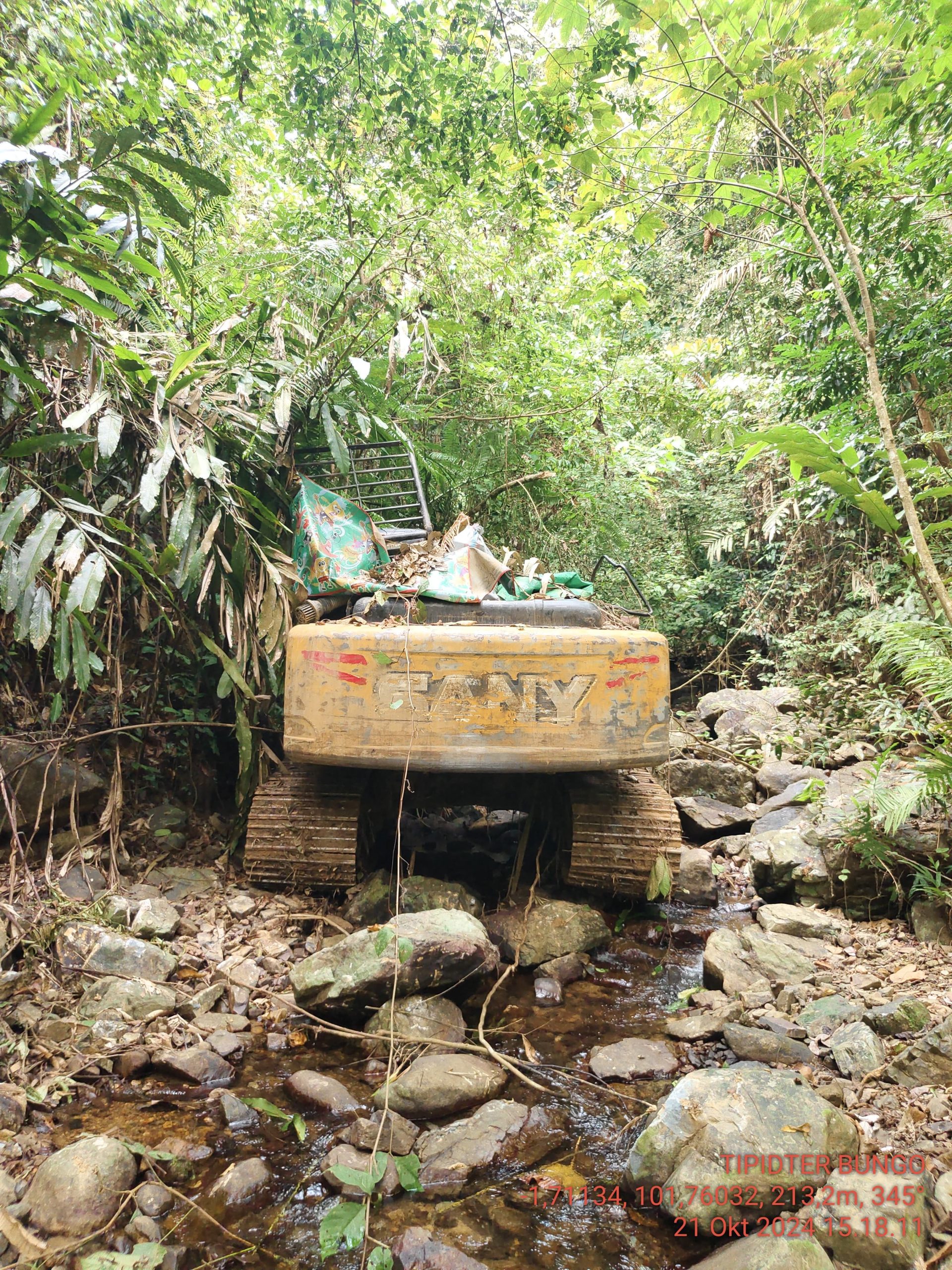 Ia menerangkan, setelah mengikuti jejak alat berat, pihak kepolisian berhasil menemukan satu buah alat berat jenis Excavator merk SANY warna kuning yang ditutupi dengan tumpukan kayu dan ranting.