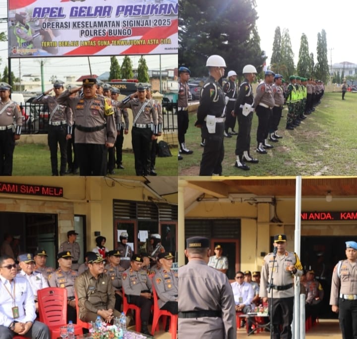 Kepolisian Resor Bungo (Polres) Bungo menggelar Apel Operasi Keselamatan Siginjai dalam rangka tertib berlalu lintas guna terwujudnya Asta Cita, bertempat di Lapangan Mapolres Bungo, Senin (10/2/2025).