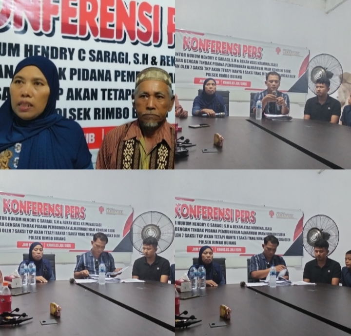 Berdasarkan keterangan konferensi pers yang dilaksanakan di kantor Hukum Hendry C Saragi, SH., Muara Bungo atas Kriminalisasi Penanganan Perkara dengan Tindak Pidana Pembunuhan Almarhum Imam Komaini Sidik yang Diduga dilakukan oleh 7 Saksi di TKP akan tetapi hanya 1 Saksi yang menjadi tersangka oleh Polsek Rimbo Bujang Kabupaten Tebo.