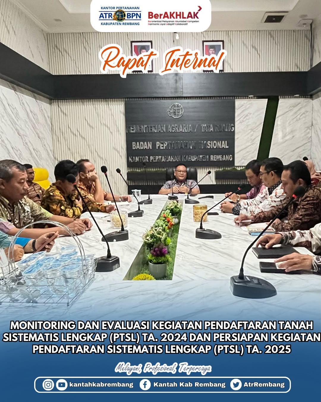 Rembang, Kompas86.com – Kamis (20/02/2024), Telah dilaksanakan Rapat Internal Monitoring dan Evaluasi Kegiatan Pendaftaran Tanah Sistematis Lengkap (PTSL) Tahun Anggaran 2024 dan Persiapan Kegiatan Pendaftaran Tanah Sistematis Lengkap (PTSL) Tahun Anggaran 2025.