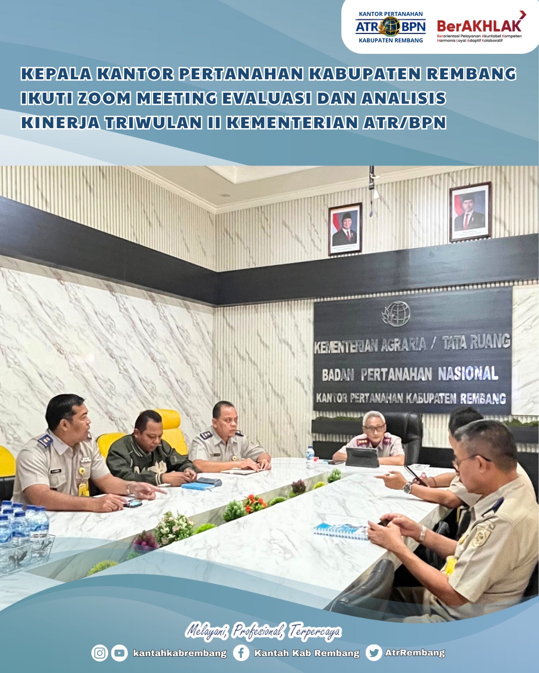 Rembang – Kepala Kantor Pertanahan Kabupaten Rembang, Sun Eddy Widijanto, beserta Pejabat Pengawas mengikuti Rapat Evaluasi dan Analisis Kinerja Program dan Kegiatan Kementerian Agraria dan Tata Ruang/Badan Pertanahan Nasional (ATR/BPN) Triwulan II Tahun 2025. Kegiatan ini diselenggarakan secara daring oleh Biro Perencanaan dan Kerjasama pada Senin (14/07/2025).