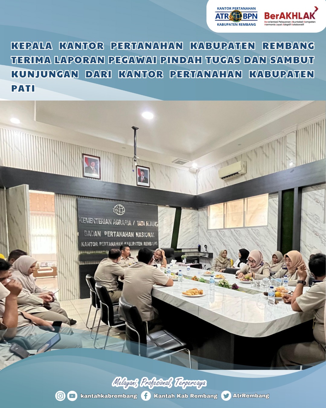 Rembang – Kepala Kantor Pertanahan Kabupaten Rembang menerima laporan resmi perpindahan pegawai sekaligus kunjungan kerja dari Kantor Pertanahan Kabupaten Pati pada Senin (28/07/2025) di ruang rapat kantor.