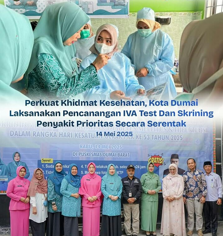 DUMAI kompas86.com- Dalam rangka peringatan Hari Kesatuan Gerak (HKG) Pembinaan Kesejahteraan Keluarga (PKK) ke-53, Pemerintah Kota Dumai melalui TP PKK Kota Dumai melaksanakan pencanangan pemeriksaan IVA Test deteksi dini kanker leher rahim dan skrining penyakit prioritas (diabetes melitus dan hipertensi), Rabu (14/5/2025).