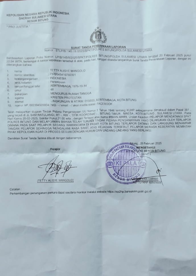 Tetapi yang membuat Ketua Umum Dewan Pimpinan Pusat Asosiasi Keluarga Pers Indonesia, Rino Triyono.,S.Kom.,S.H.,C.IJ.,C.BJ.,C.EJ., sangat murka kepada jajaran Kepolisian khususnya Polresta Kota Bitung telah terjadi pembiaran terhadap pemukulan terhadap Ketua DPD AKPERSI Provinsi Sulawesi Utara , Tetty Alisye Mangolo, S.Pd.,C.BJ., saat mewawancarai Kasat Intelkam Polres Bitung, Kapolsek Maessa, dan beberapa pedagang pada Pukul 21.05 WITA. Padahal jelas di dalam Undang – Undang Pers Nomor 40 Tahun 1999 pihak kepolisian harus memberikan perlindungan hukum kepada wartawan saat melaksanakan Kinerjanya. Bahkan Kasat Intelkam Polresta Kota Bitung langsung meninggalkan begitu saja saat adanya peristiwa pemukulan kepada wartawan bukan langsung mengamankan atau menindak tegas oknum Anggota Ormas tersebut.Pelaku Pemukulan diduga bernama Irwan Amiri, yang disebut – sebut sebagai anggota ormas Barisan Fisabilillah ( Bifi) dan juga anggota APPSI Kota Bitung.
