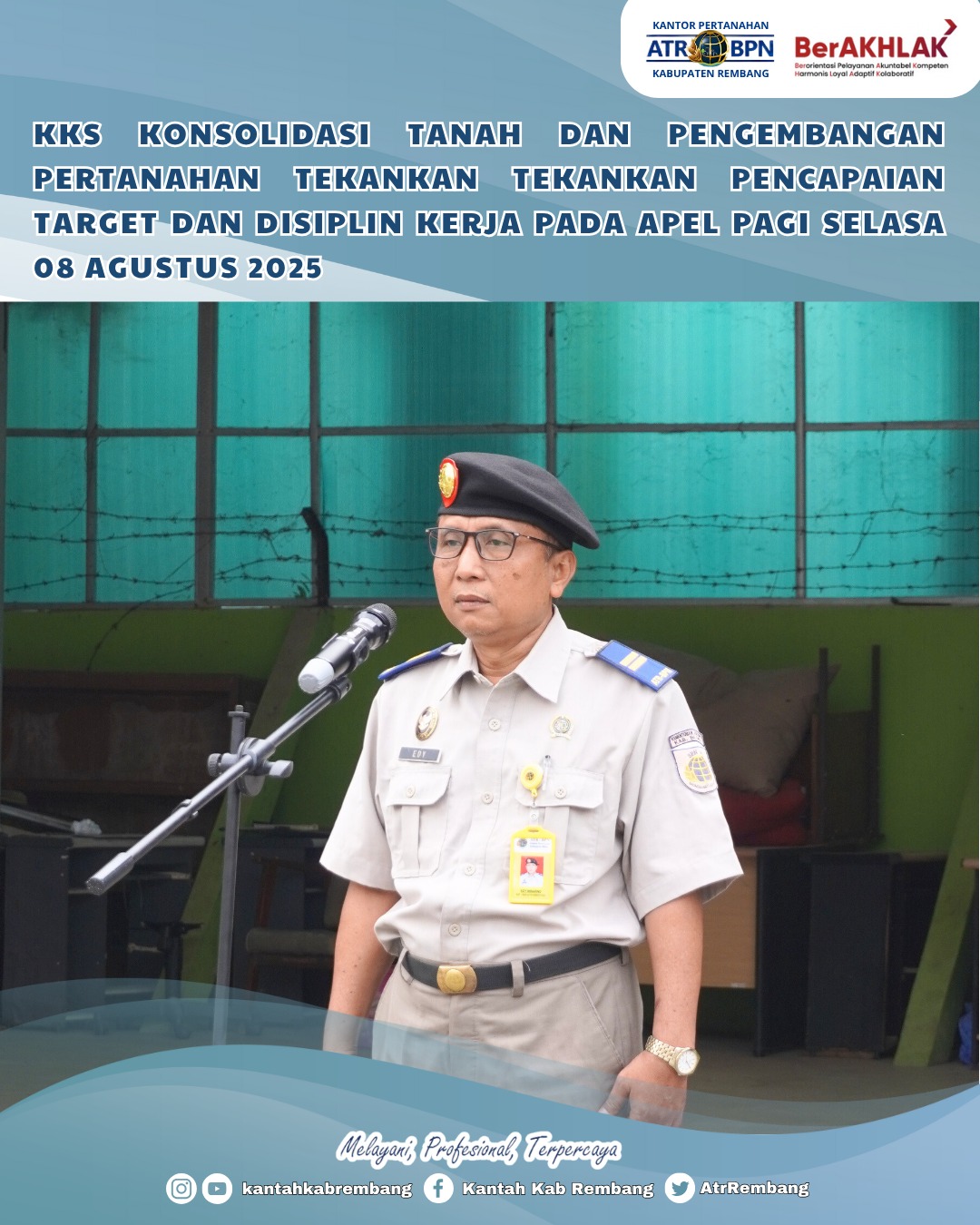Rembang – Kantor Pertanahan Kabupaten Rembang melaksanakan apel pagi pada Selasa (05/08/2025) yang diikuti oleh seluruh pegawai, meliputi PNS, PPPK, PPNPN, serta ASK Kantor Pertanahan. Pada kesempatan tersebut, Edy Winarno selaku Kepala Seksi (KKS) Konsolidasi Tanah dan Pengembangan Pertanahan bertindak sebagai pembina apel.