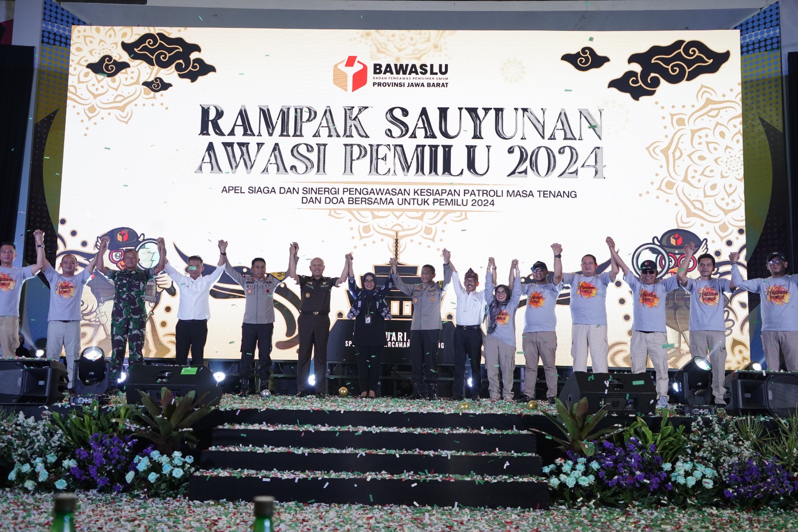 Pangdam III/Siliwangi Mayjen TNI Erwin Djatniko dan Kapolda Jabar Irjen Pol Akhmad Wiyagus bersama PJ. Gubernur Jabar Bey Triadi Machmudin mengikuti Rampak Sauyunan Awasi Pemilu 2024 dalam rangka Apel Siaga dan Sinergi Pengawasan Kesiapan Patroli Masa Tenang dan Doa Bersama untuk Pemilu 2024 di Gedung Sport Jabar Arcamanik Kota Bandung, Jum’at (09/02/2024).