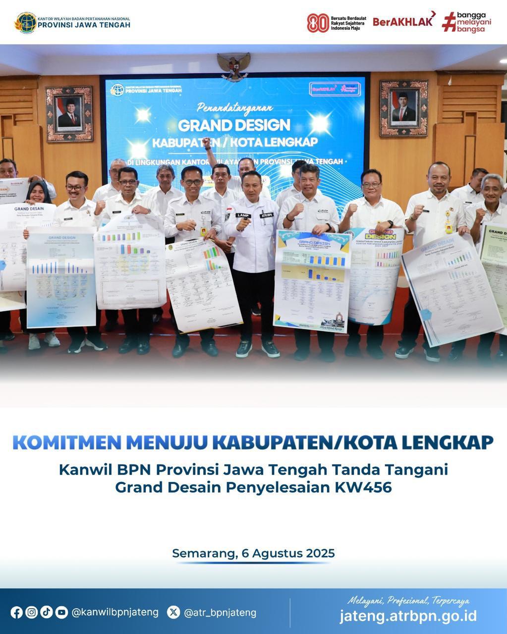 Semarang, 6 Agustus 2025 – Kanwil BPN Provinsi Jawa Tengah resmi melaksanakan penandatanganan Grand Desain sebagai bentuk komitmen bersama dalam menyelesaikan KW456 . Kegiatan ini dihadiri oleh Kepala Kantor Pertanahan se-Jawa Tengah, para Pejabat Administrator, serta para Kasi 1 dan Kasi 2 dari seluruh Kantah di Jawa Tengah.