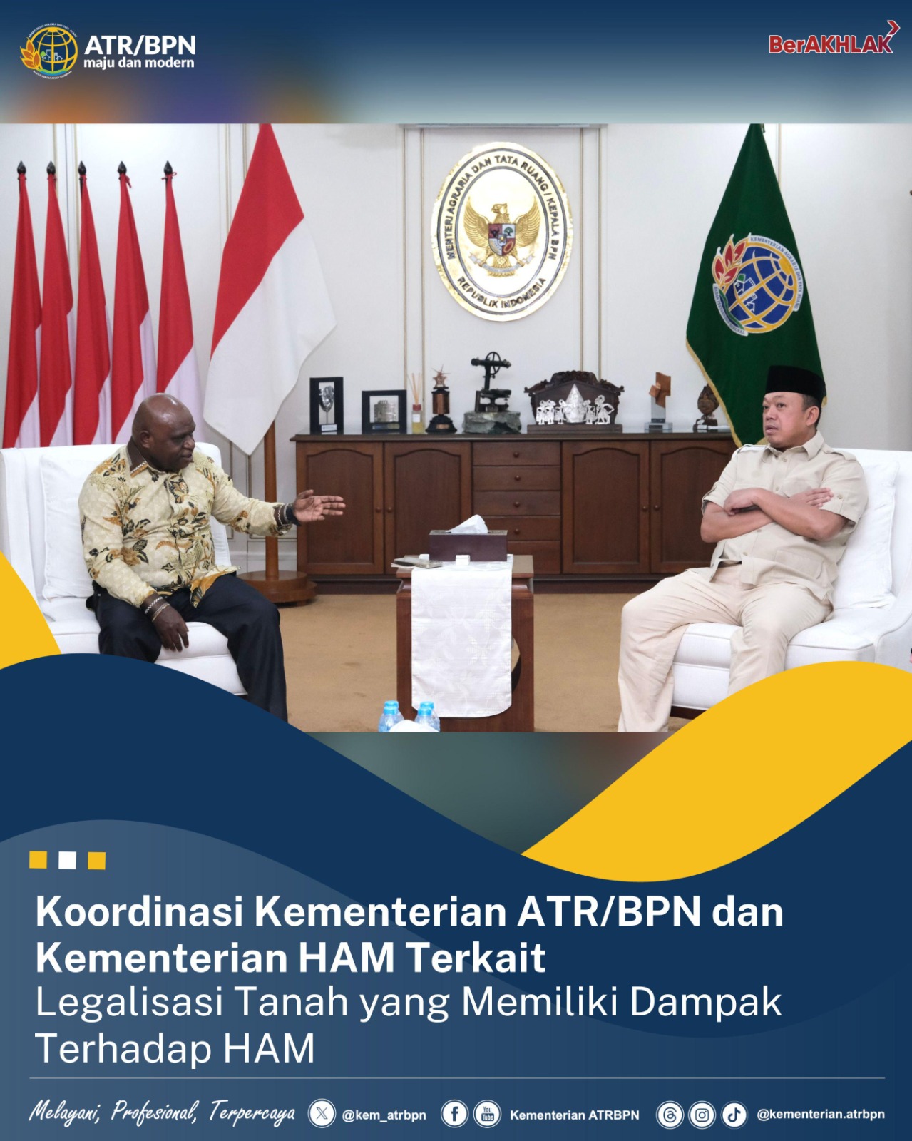 Jakarta,Kompas86.com – Kementerian Agraria dan Tata Ruang/Badan Pertanahan Nasional (ATR/BPN) berkoordinasi dengan Kementerian Hak Asasi Manusia (HAM) terkait administrasi pertanahan. Pertemuan antara Menteri ATR/Kepala BPN, Nusron Wahid, dengan Menteri HAM, Natalius Pigai ini berlangsung di Ruang Kerja Menteri ATR/Kepala BPN pada Rabu (15/01/2025).