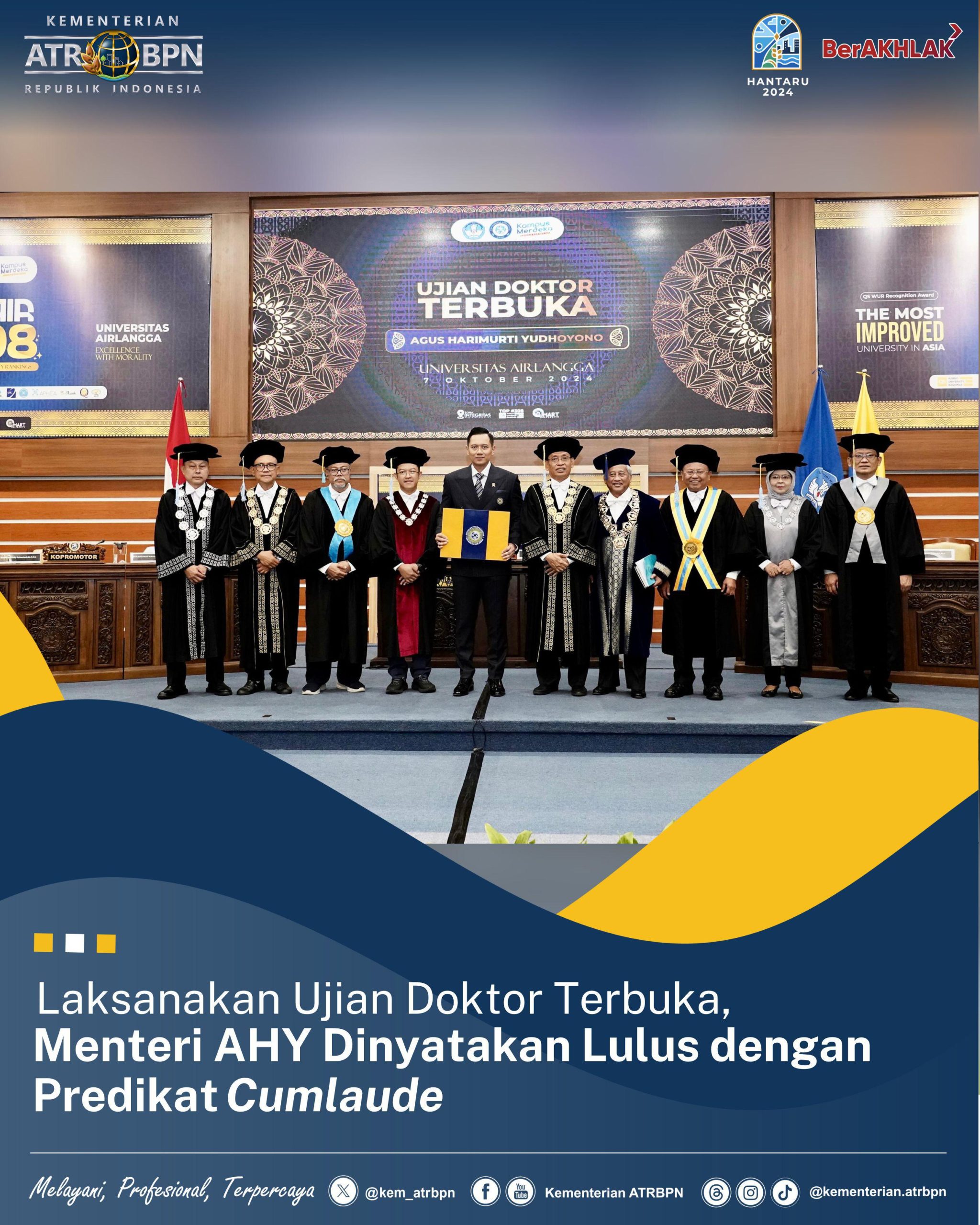 Berdasarkan hasil rapat yudisium Ujian Doktor Terbuka, Pimpinan Sidang menyatakan Menteri AHY lulus dalam masa studi 3,1 tahun dengan predikat _Cumlaude_ alias Dengan Pujian. Menteri AHY juga sekaligus menjadi Doktor ke-88 dari Program Studi Pengembangan Sumber Daya Manusia. “Saudara dinyatakan sebagai Doktor lulusan Universitas Airlangga yang _excellence with morality_,” ucap Rektor Universitas Airlangga, Prof. Dr. Moh. Nasih, SE, MT, Ak.