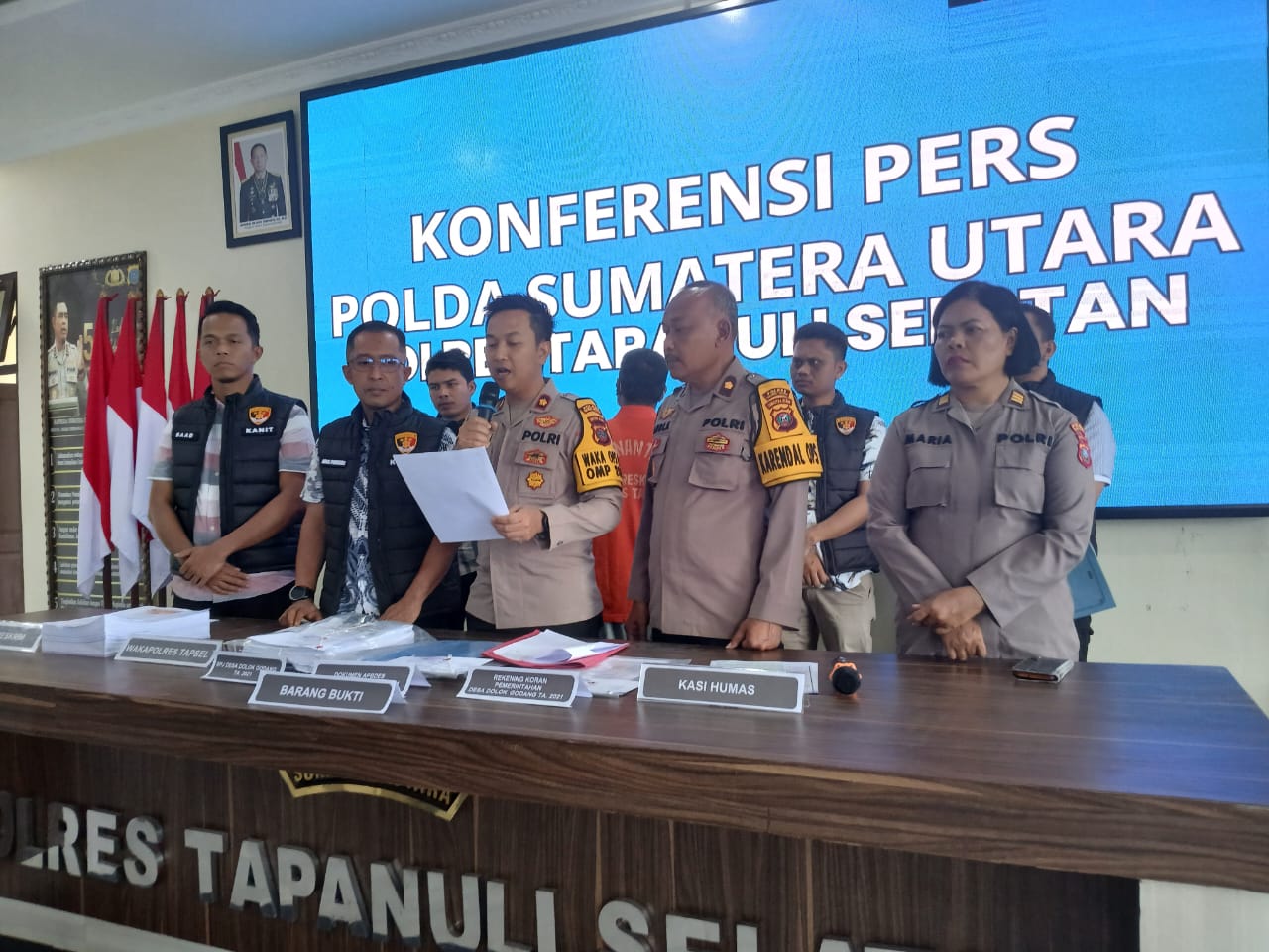 Kapolres Tapsel AKBP. Yasir Ahmadi SIK.MH diwakili Waka Polres Kompol Rapi Pinarki.SH.SIK.MHdi dampingi Kasat Reskrim, IPTU Agus Purnomo.SH.MH Kasi Humas AKP. Maria Marpaung.SE.MMKanit Tipidkor. IPDA Saat Mardia.SH pada Konperensi per kepada beberapa Awak media Online dan Tv di Aula Mapolres Tapsel Sipirok, Kabupaten Tapanuli Selatan Jumat 18 Oktober 2024.