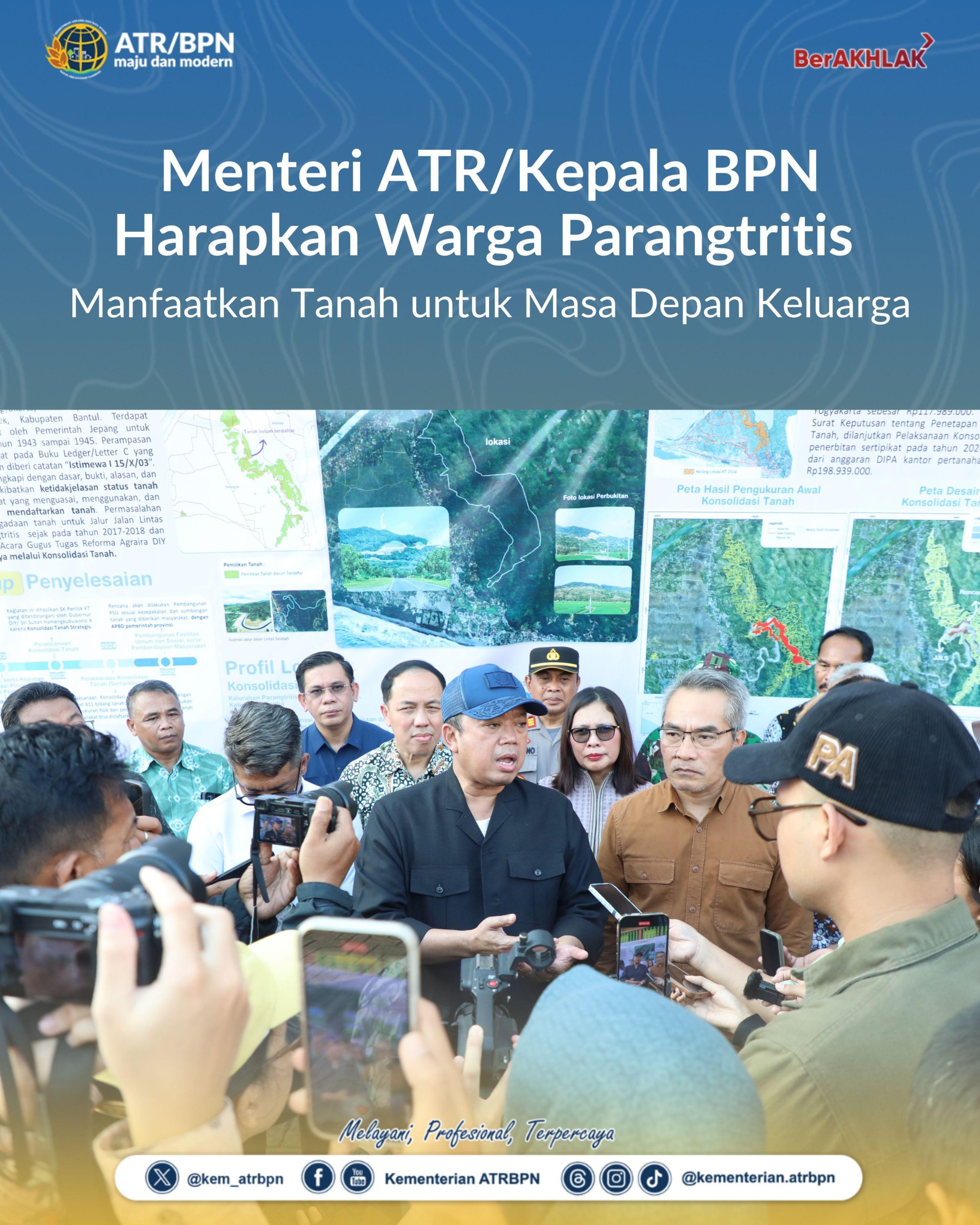“Tolong rawat tanah ini dengan baik, silakan ditanami apa pun yang penting menghasilkan. Bisa untuk menyekolahkan anak. Semoga berkah dan dapat dinikmati anak cucu Bapak, Ibu untuk ke depannya,” ucap Menteri Nusron usai menyerahkan 811 sertipikat hasil program Konsolidasi Tanah di Kantor Lurah Parangtritis, Kabupaten Bantul, D.I. Yogyakarta.