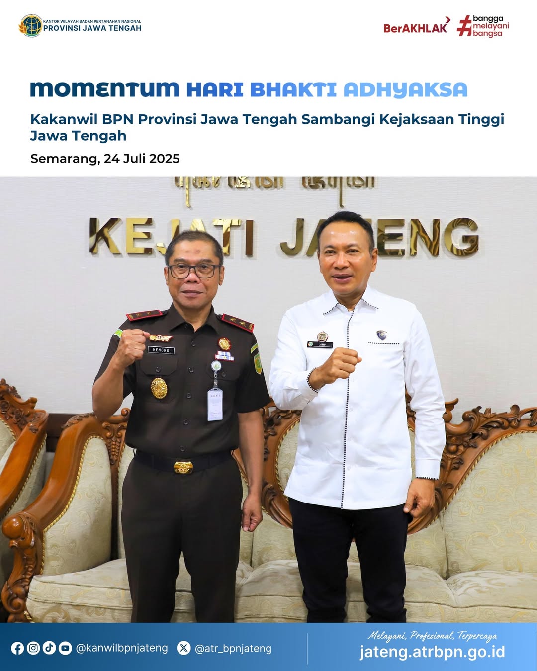 Wujud sinergi antar Lembaga, Kakanwil BPN Provinsi Jawa Tengah didampingi oleh para Pejabat Administrator Kanwil BPN Provinsi Jawa Tengah serta Kepala Kantor Pertanahan Kota dan Kabupaten Semarang melakukan kunjungan silaturahmi ke Kejaksaan Tinggi Jawa Tengah dan memberikan ucapan selamat atas peringan Hari Bhakti Adhyaksa yang ke 65.