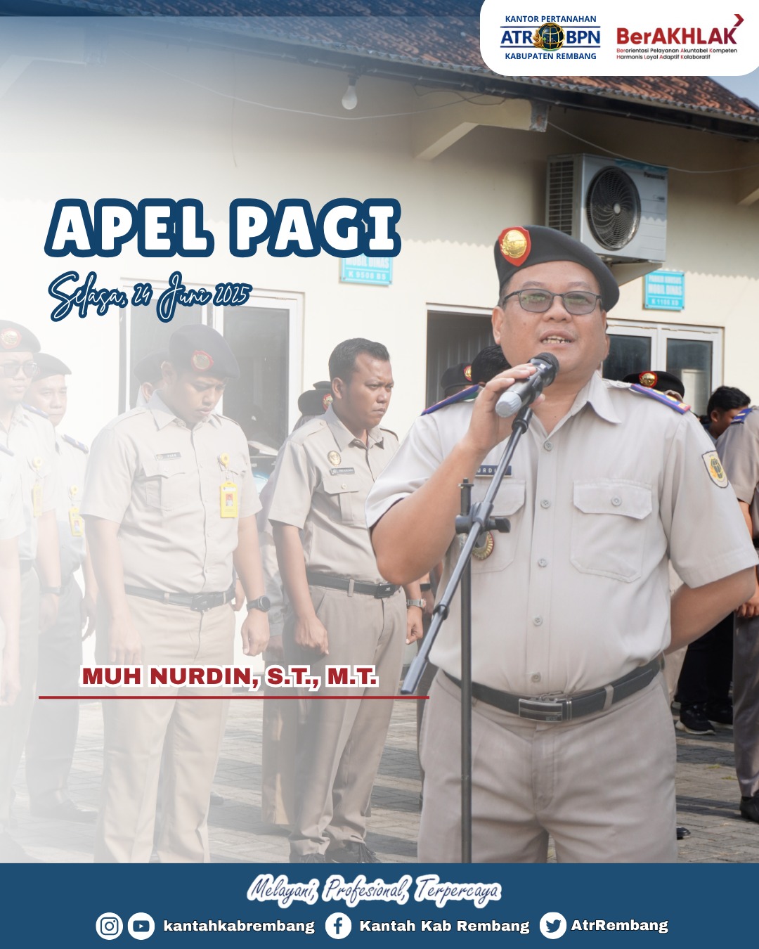 Rembang — Suasana haru menyelimuti pelaksanaan apel pagi di halaman Kantor Pertanahan Kabupaten Rembang pada Selasa (24/06/2025). Apel kali ini menjadi momen terakhir bagi Muh. Nurdin, S.T., M.T. sebagai pembina apel sebelum dirinya resmi berpindah tugas ke Kantor Pertanahan Kabupaten Jepara, menyusul pelantikan dan pengambilan sumpah jabatan administrasi yang baru-baru ini dilaksanakan.