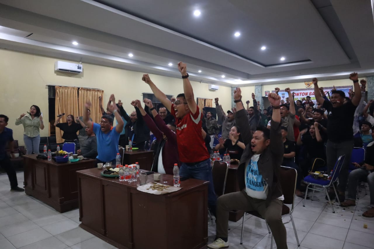 Polres Toba Polda Sumut bersama jajaran Polsek menggelar nonton bersama (nobar) semifinal Piala Asia U-23 tadi malam di Aula Harungguan Mademak Mapolres Toba, Senin (29/04/2024)